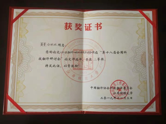 大会共设四个分论坛:分论坛一为机器翻译及其应用;分论坛二为科技和术语翻译;分论坛三为典籍翻译,分论坛四为实用文体翻译,大家就自己研究的领域进行了踊跃发言和热切讨论。Beat365MTI导师冷冰冰副教授、邹建玲副教授及MTI研究生夏菁、张红参加了此次学术盛会。邹建玲副教授在分论坛四进行了题为“信、达、雅在翻译实践中的运用---以《简单规则》的英译汉为例”的论文宣读。冷冰冰副教授指导研究生夏菁同学和张红同学在分论坛二分别完成题为“科技翻译中的术语变体与译者对策”及“揭开术语变体山真面目---《术语变体研究的多元视角》介评”的论文宣读。在本次研讨会上,夏菁和冷冰冰副教授合作的论文“科技翻译中的术语变体与译者对策”在优秀论文评奖中荣获三等奖。