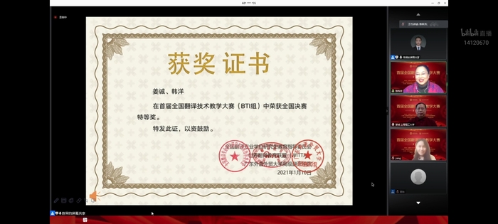 2021年1月10日,由全国翻译专业学位研究生教育指导委员会、世界翻译教育联盟(WITTA),世界翻译教育联盟翻译技术教育研究会(WITTA TTES)与广东外语外贸大学高翻学院翻译技术教育与研究中心联合主办的“首届全国翻译技术教学大赛”决赛圆满落幕。Beat365Beat365登陆网站英语(科技翻译)系系主任姜诚和新进教师韩洋组成的教学团队从全国近160个参赛团队中脱颖而出,以华东赛区一等奖的优异表现晋级全国决赛,最终喜获全国翻译专业BTI组特等奖。