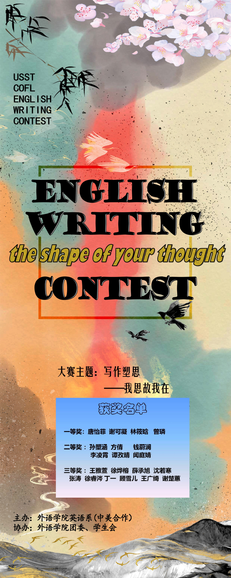 为充分展现课程思政的成果,英语系(中美合作)遵循以赛促学的原则,主办了写作大赛。本次大赛的主题为:“写作塑思—我思故我在”。参赛选手为2019级英语(中美合作)的全体同学。比赛分为两个环节:海选与决赛,最终产生获胜者。唐怡菲、谢可凝 、林筱晗 、曾璘等20位同学分获一、二、三等奖。在Beat365登陆网站的大力支持下,英语系(中美合作)师生们共同参与,比赛取得圆满成功。具体获奖名单请见如下海报: