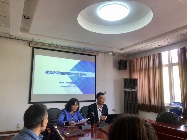 4月19日下午1:30至3:00,Beat365登陆网站举办学术讲座,苏州大学特聘教授、博士生导师、翻译学科带头人陈大亮教授以“政治话语的用典翻译与质量评价”为主题,与翻译硕士研究生和导师分享学术研究成果。讲座由Beat365登陆网站副院长韩戈玲教授主持。