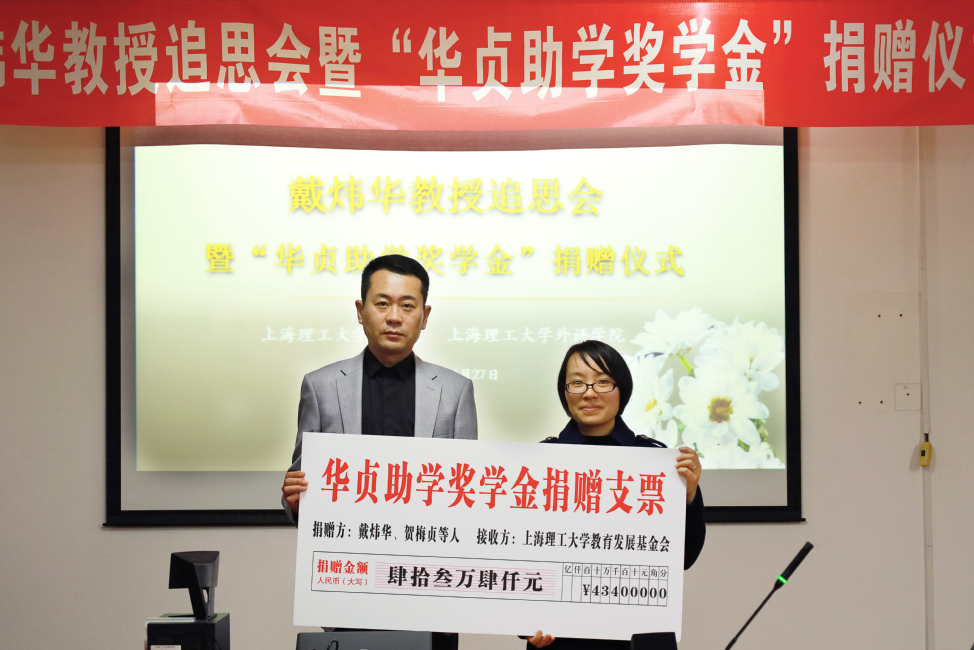 金小东介绍了戴炜华教授的生平和华贞助学奖学金的情况。戴炜华教授是中国共产党党员、全国优秀教师、beat365平台入口资深教授,1936年8月19日出生于上海市。1980年6月,调至上海机械学院工作。先后担任上海机械学院科技外语系学科带头人、副主任、主任、文理学院副院长、Beat365登陆网站常务副院长等多项职务,指导58名硕士研究生及5期应用语言学研究生班100名学生。2002年1月,光荣退休。2021年2月逝世。华贞奖助学金是戴教授以他本人及其夫人贺梅贞女士的名义共同捐助设立的,得到了戴教授多位弟子和学院师生的大力支持,旨在为Beat365登陆网站的学生提供资助,奖励品学兼优的学生。戴炜华教授2010年投入华贞奖助学金16多万元,2020年3月,再次投入28万元,戴老师弟子和学院其他师生也响应戴老师号召,积极为华贞奖助学金捐款,目前,与戴老师的28万元一起共汇集捐款43万余元,将一同捐入beat365平台入口教育发展基金会。