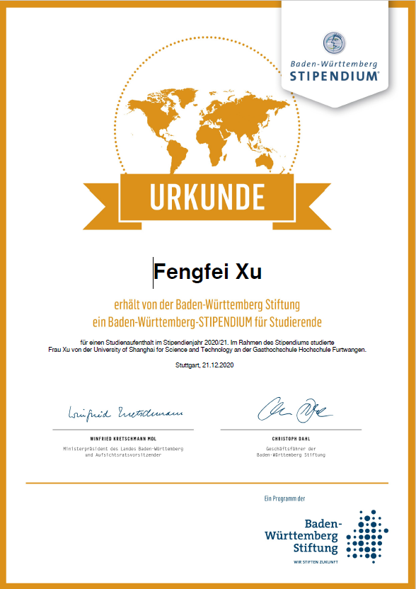 2020年10月,Beat365与德国富特旺根应用技术大学开展冬季学期海外交流,选拔出数名学生赴德进行交流学习。其中,Beat3652017级研究生徐凤霏在德学习期间荣获巴登-符腾堡州奖学金。