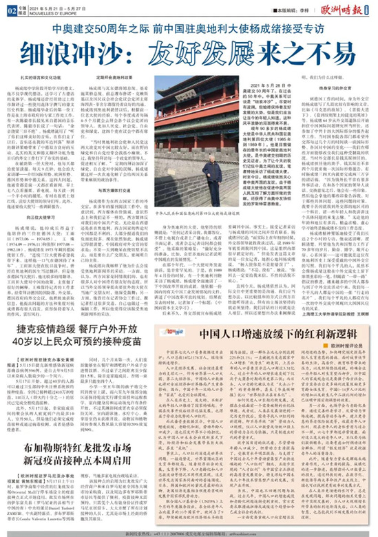 今年5月28日将是中奥两国建交50周年的纪念日。5月21日,王婀娜副教授在《欧洲时报》中东欧头版头条的位置上发表了《中国奥地利建立外交关系50年来平等对话、友好交往启迪当今世界动荡局势——细浪冲沙 互利共赢造福人民》一文。