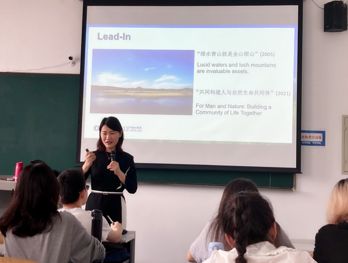 当天上午,公共英语教研中心教学骨干左秀媛博士在1100号校区第二教学楼开设《学术英语读写》课程思政公开课,教研中心十余名同行教师前去观摩学习。左老师的课堂聚焦于“环境保护”。她精心挑选了一篇有关环境问题的高影响力论文,在讲授英文文献阅读技巧的同时,回顾了历史上党和国家领导人的生态文明建设思想,引出环境问题是关系国家发展的关键问题。左老师指导学生收集体现绿色发展观和中国担当的中英文文献,开展口头陈述和英汉互译练习,使学生在提升科研素养和学术精神的同时,了解我国在环保方面做出的不懈努力,增强了学生的民族自豪感。