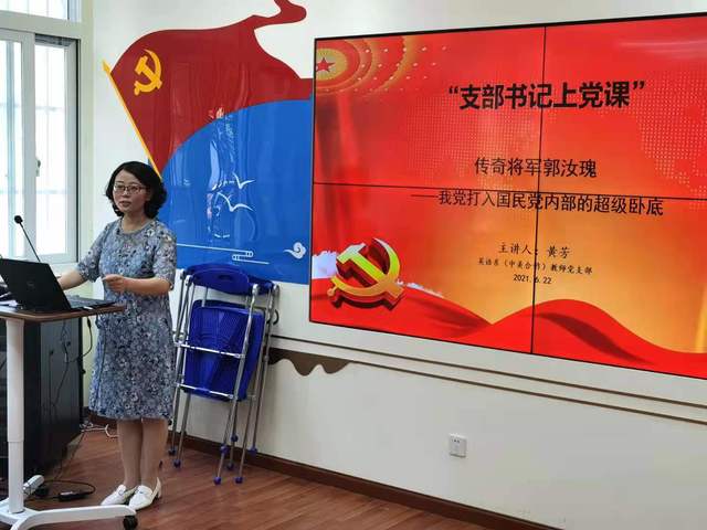 活动中,黄芳以“传奇将军郭汝瑰——我党打入国民党内部的超级卧底”为主题,为支部成员们上了一堂生动而深刻的党课。在书记细心、全面的讲授指引下,支部全体党员教师对郭将军宏伟壮阔、奋斗不息的辉煌一生有了全方位了解,并深刻领悟到了历经千锤百炼而不变色的共产主义信念是支撑郭将军坚持长期秘密战线斗争的根本力量之源。党员教师们对此都表达了由衷的赞许和感佩。