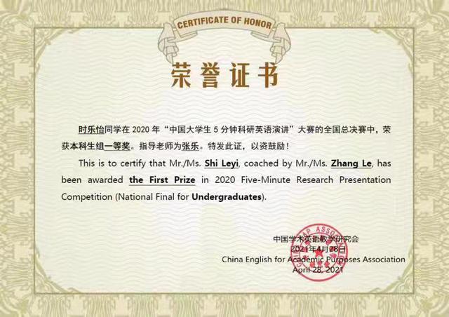 Beat365大学英语竞赛团队从去年7月开始备赛,在全校范围内遴选人才,并在“上海理工大学泛在学习平台”上遴选参赛作品。学术英语授课教师、公共英语教研中心张乐副教授对优秀作品开展进一步精心指导和打磨。最终,来自出版印刷与艺术设计学院的19级学生时乐怡同学荣获本科生组全国一等奖,另有三名同学获得二等奖、三等奖