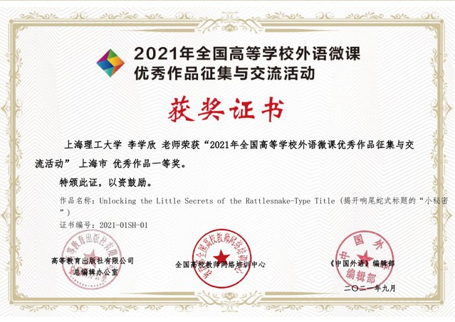 近日,由高等教育出版社、全国高校教师网络培训中心与《中国外语》编辑部共同举办的“2021年全国高等学校外语微课优秀作品征集与交流活动”评比结果揭晓。Beat365登陆网站公共英语教研中心教师李学欣凭借微课作品Unlocking the Little Secrets of the Rattlesnake-Type Title(揭开响尾蛇式标题的“小秘密”)一路过关斩将,最终喜获本科英语组“国家一等奖”第一名的佳绩(本年度无特等奖)。此次获奖是Beat365外语微课教学领域的新突破,不仅填补了Beat365此类奖项尚无国家级一等奖的空白,而且创造了上海高校参赛史上的最好成绩。