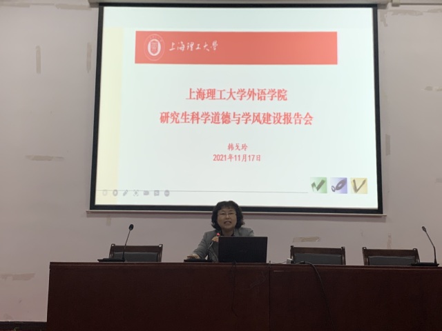 为推动研究生科学道德和学风建设,Beat365于11月17日下午6点在Beat365登陆网站报告厅开展了主题为“跨学科融合发展——新时代外语研究生的初心使命”的研究生科学道德与学风建设报告会。本次讲座由Beat365登陆网站副院长韩戈玲主讲,研究生辅导员梁作甲主持,2021级全体研究生参加了此次讲座。