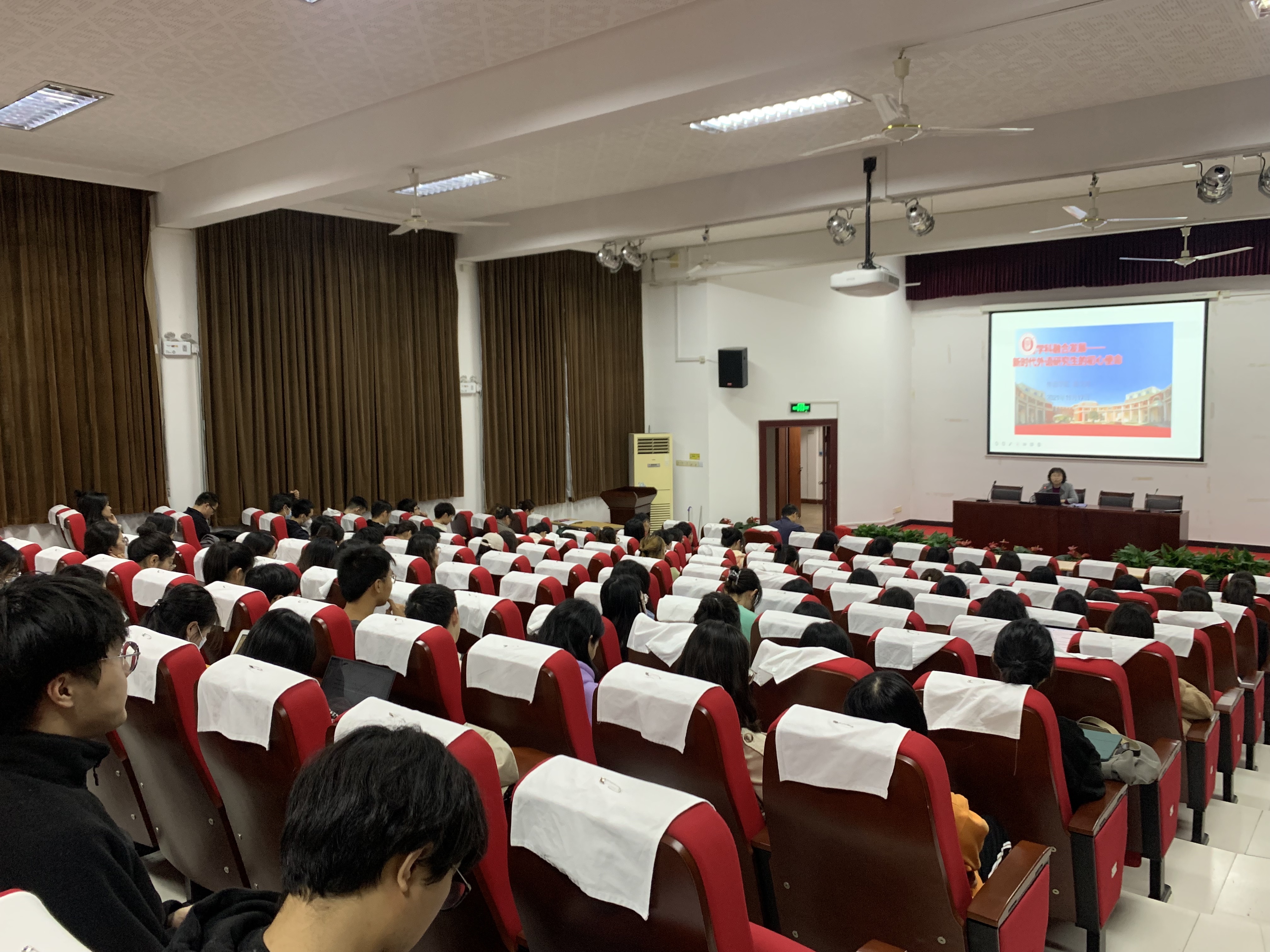 韩戈玲老师首先指出新时代外语研究生教育是时代的需求。研究生教育要瞄准科技前沿和关键领域,加快培养国家急需的高层次人才。习近平总书记强调,讲好中国故事,传播好中国声音,展示真实、立体、全面的中国,是加强我国国际传播能力建设的重要任务。随后,韩老师介绍了外国语言文学和英语笔译专业的学习课程以及大致情况,鼓励研究生找到自己感兴趣的领域并深入学习,并强调研究生应不断升高自身英语语言水平并多参加高水平比赛。其次,韩老师指出学科交叉是时代发展不可或缺的因素,外语专业的学生也应培养理工科素养。她还介绍了学院的一些实验室以及团队项目,如语言认知加工实验室、神经认知语言学研究团队,人工语音合成研究团队以及医工交叉联合培养研究生。接着,韩老师强调了学术诚信问题,告诫同学们一定要注意学术规范,杜绝抄袭,发论文之前一定征求导师同意,文字雷同是底线。她再三强调学术规范的重要性,学术之路没有捷径可走,要求全体研究生始终对学术保持敬畏,严于律己,学好马克思主义理论知识,承担起新时代研究生的历史使命。最后,韩老师详细地介绍了研究生奖学金体系和各类评奖细则,讲述了许多生动的评奖案例,并向大家征求有关评奖细则的意见。