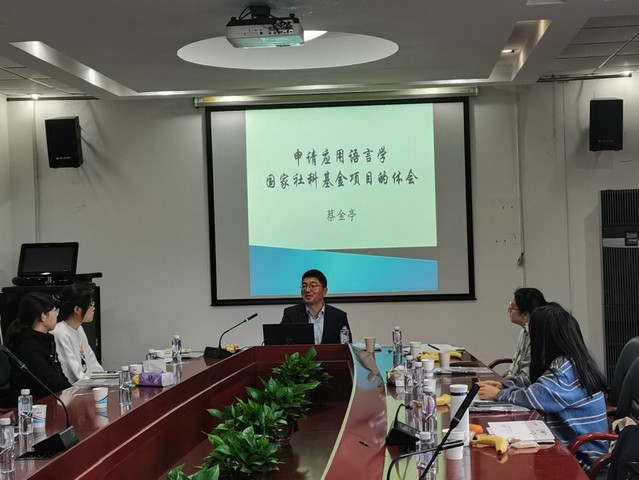 蔡教授之后还进行了课题申报辅导,通过申报书实例讲解了课题申报技巧,从选题、文献综述、研究内容、研究思路等方面进行详细介绍。最后,蔡教授还就项目申报书与部分教师进行一对一交流,为老师们进一步提高申报书质量提出了建设性意见。