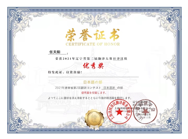 近日,第二届辽宁省翻译大赛圆满落幕。我院日语系教师郭丽指导2020级日语专业任天阳同学荣获日译汉组优秀奖。
