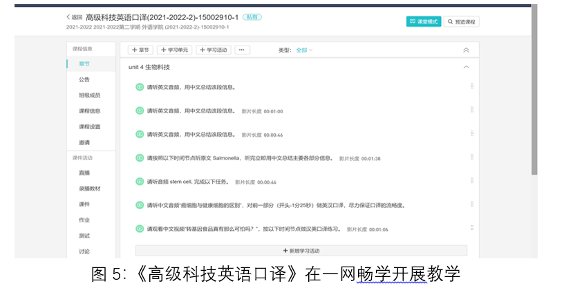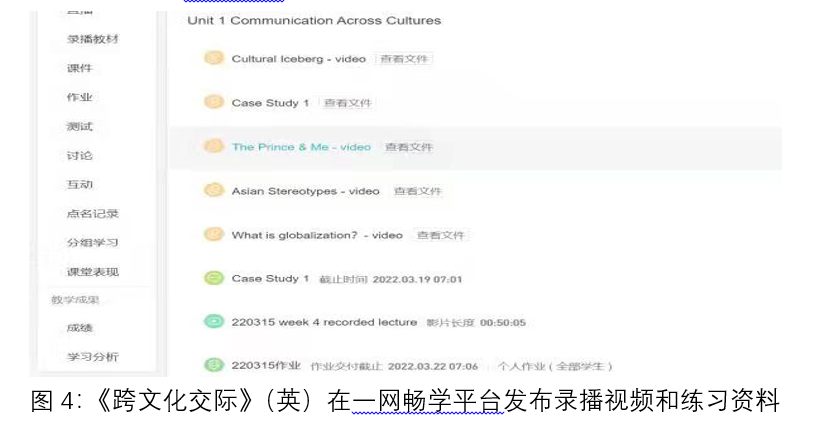 “语言+专业”类课程对于内容讲解的清晰度及逻辑度要求较高,还有一些课程的练习量较大,这些课程主要在一网畅学平台开展教学活动。贾晓庆主讲的《高级科技英语口译》、韩洋主讲的《跨文化交际学》(英)、黄凤秋等主讲的《跨文化交际》以“理论+操练”为特色,主要采用录播(介绍理论和方法)+平台发布练习资料+平台师生讨论的方式。
