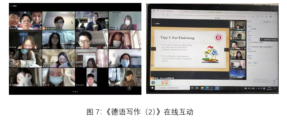 “互动类”课程对师生交流要求较高,任课教师使用一网畅学平台和腾讯会议相结合的方式,通过共享屏幕为学生进行课程知识的传授和讲解,使教学效果尽量接近线下授课。张俊锋、智玉英主讲的《中外科技前沿纵览》、杨一天主讲的《德语写作(2)》、王彦花等主讲的《交互综合英语》课程上,为保证在线教学和课堂教学达到同样的授课效果,老师们纷纷化身为热情洋溢的主播,精心设计课堂任务,积极与同学们进行实时互动,并通过线上作业严格监督同学们的复习情况,从各个环节保证了同学们的学习效果。