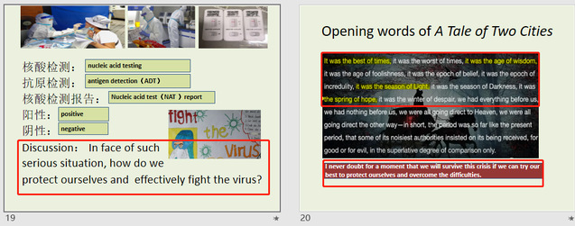 贾晓云老师在《综合英语(文学人生)》课程中融入防疫、抗疫元素。在讲授“酸性海洋”(Acidic ocean)时,她引导学生积极联想,学会用英语表达“核酸、抗原、阴性、阳性”等概念,帮助学生积累防疫相关英语词汇。通过让学生们倾听狄更斯《双城记》小说的经典开篇,启示同学们虽然现在处于最艰难的时刻,但只要树立信心,同心合力,共克时艰,一定会战胜疫情。