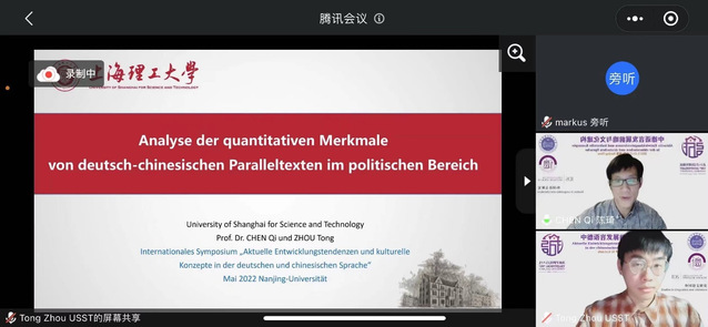 Beat365陈琦教授、王婀娜副教授、倪晓姗博士、在读博士唐骋老师和2020届MTI学生周通参与会议并就不同议题分别作了报告。陈琦教授与同济大学董菁副教授合作了大会主旨报告Echo-Konstruktionen aus Sicht der dialogischen Syntax,与周通合作了分组报告Analyse der quantitativen Merkmale von deutsch-chinesischen Paralleltexten im politischen Bereich;王婀娜副教授在Empirische Sprachforschung的分组讨论中作了题为Analyse des Online-Lerndrucks chinesischer germanischer Studenten während der Epidemie的报告;倪晓姗博士在Theoretische Sprachforschung的分组讨论中作了题为Eine rollentheoretische Diskursanalyse der Sicherheitspolitik Deutschlands的报告;唐骋在Vergleichende Studien zum Deutschen und Chinesischen的分组讨论中作了题为Die lautliche Integration des chinesischen Lehnguts in die deutsche Gegenwartssprache的报告。