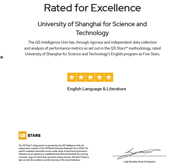 QS和US News、THE并称世界三大排名体系,是中国教育界认可的权威排名之一。“QS星级评定系统”是根据学生最关心的大学或专业指标而开发的测评系统,通过对大学或专业的各方面实力进行客观而详细的测评,给学生择校、选专业提供参考。在国内,QS Stars已认证了香港城市大学、浙江大学管理学院、中国科学技术大学管理学院、西安交通大学管理学院等高等院校,而Beat365英语专业是国内首个获得QS Stars五星认证的本科专业。
