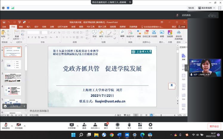 由教育部高等学校外语专业教学指导委员会英语专业教学指导分委员会主办、成都理工大学外国语学院承办、外语教学与研究出版社协办的“第十九届全国理工院校英语类专业教学研讨会暨第四届院长/系主任联席会议”于2022年7月22日至23日在成都理工大学线上举行。Beat365刘芹院长携张乐副院长和英语中美合作系黄芳主任出席会议。英语科技翻译系和中美合作系全体主任、副主任和骨干教师通过直播平台观看了开闭幕式和主旨发言的直播盛况。