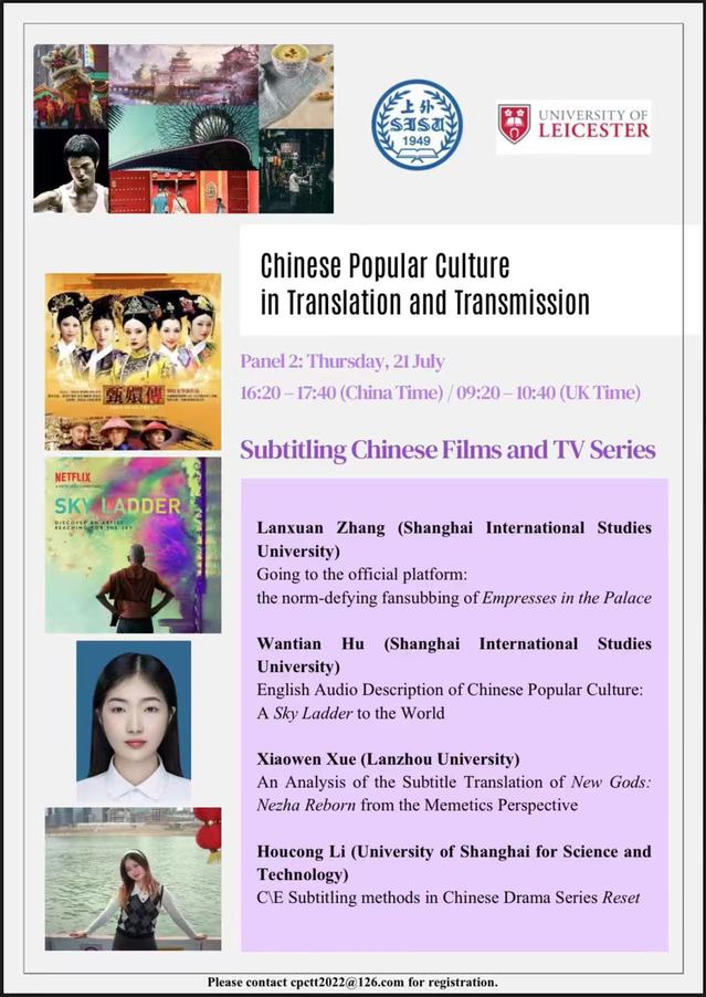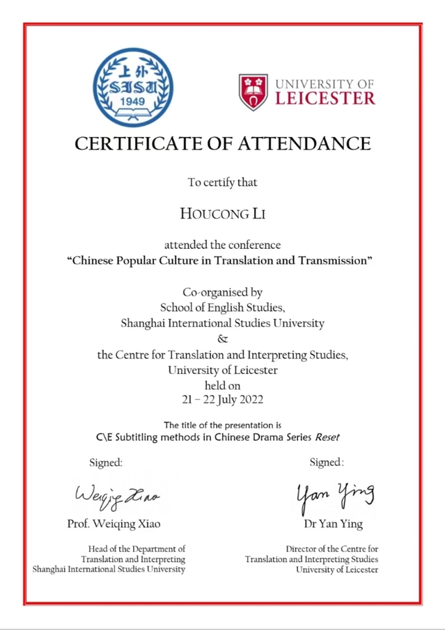 7月21日-22日,正值暑假期间,来自Beat365英语系(中美合作)的本科生李侯聪同学参加了由上海外国语大学和英国莱斯特大学联合主办的“翻译与传播中的中国流行文化”(Chinese Popular Culture in Translation and Transmission)为期两天的线上国际学术会议。她在分论坛用流畅地道的英语,全文宣读了自己的翻译学术论文《功能目的论下网剧<开端>中意译字幕》(“C/E Subtitling Methods in Chinese Drama Series Reset”),获得了与会专家的好评。该论文由Beat365英美文学方向硕士生导师王影君副教授全程指导。