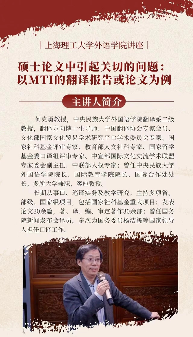 9月20日下午,中央民族大学外国语学院翻译系二级教授、翻译方向博士生导师、中国翻译协会专家会员何克勇教授应邀通过腾讯会议,为Beat365师生作题为“硕士论文中引起关切的问题:以MTI的翻译报告或论文为例”的线上专题讲座。Beat365登陆网站诸多师生参加了此次学术讲座。