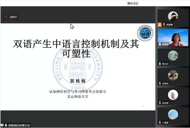 10月25日下午,北京师范大学认知神经科学与学习国家重点实验室研究院、博士生导师郭桃梅教授应邀为Beat365师生作题为“双语产生中语言控制机制的可塑性”的线上专题讲座,由Beat365登陆网站副院长韩戈玲教授主持。Beat365登陆网站的师生参与学习了本次讲座,同时也吸引了上海交通大学、广西大学、西南石油大学等众多兄弟院校的师生参与学习。