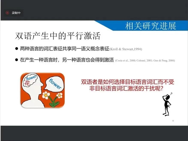 讲座伊始,郭教授提出第二语言学习热这一话题,全球学习第二语言的人数持续高涨,进而引出双语产生中的平行激活,以“双语者是如何选择目标语言词汇而不受非目标语言词汇激活的干扰?”这一问题激发同学们的思考,对抑制控制模型、双语切换任务和行为研究进行了介绍。已有研究发现,在语言产生过程中,双语者需要对非目标语言进行抑制控制。郭教授提及行为上不对称的切换代价和母语命名缓慢效应,这也反映了对优势语言具有更强的抑制。而且向观众分享了语言控制机制的最新理论:适应控制假设,强调语言控制过程对语言情景需求的适应性,混合语言情境比单一语言情境对语言控制的需求更大。