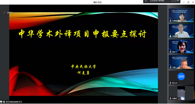 11月7日晚,中央民族大学外国语学院翻译系二级教授、翻译方向博士生导师、中国翻译协会专家会员何克勇教授应邀为Beat365教师作题为“中华学术外译项目申报要点探讨”的线上专题讲座。讲座由Beat365登陆网站院长刘芹教授主持。Beat365诸多教师参加了本次讲座。