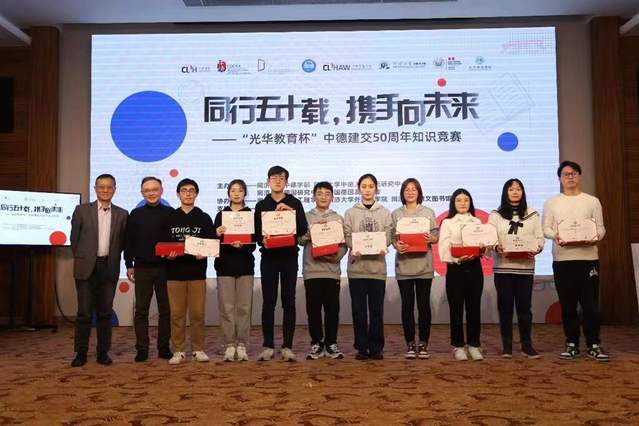 为纪念中德建交50周年,回顾过去并展望未来,进一步丰富中德人文交流,同济大学中德学部、同济大学中德人文交流研究中心、同济大学德国研究中心与中国德国友好协会联合主办的“光华教育杯”中德建交50周年知识竞赛团体赛于12月3日在上海举行并圆满落幕。Beat365德语系学生唐静、陈芊玥、陆沛譞在周磊老师的指导下,通过充分的赛前准备,凭借深厚的人文素养,经过六轮激烈角逐荣获三等奖。指导老师周磊荣获优秀指导教师奖。