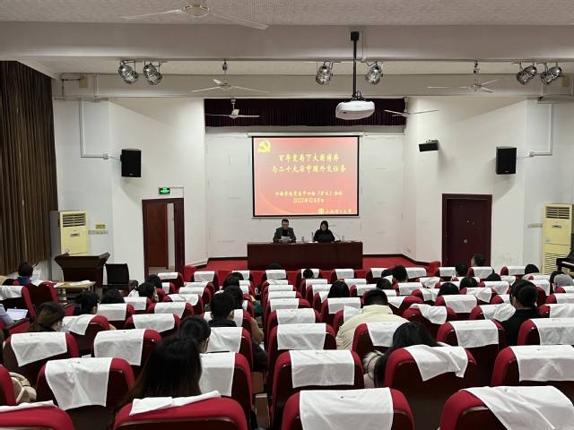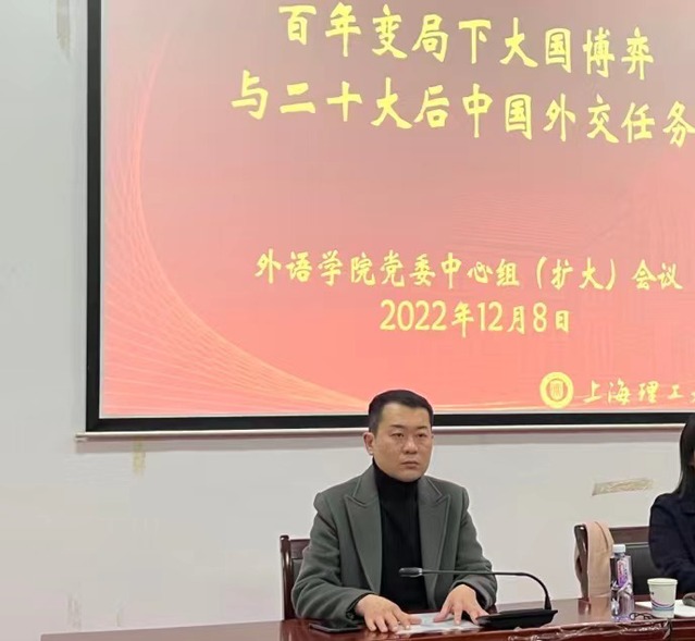 12月8日下午,Beat365登陆网站党委中心组(扩大)举行党的二十大精神专题学习会。会议邀请beat365平台入口学习贯彻党的二十大精神专家宣讲团专家、马克思主义学院仇发华教授以《百年变局下大国博弈与二十大后中国外交》为题作专题辅导报告。会议由学院党委书记曲德强主持。