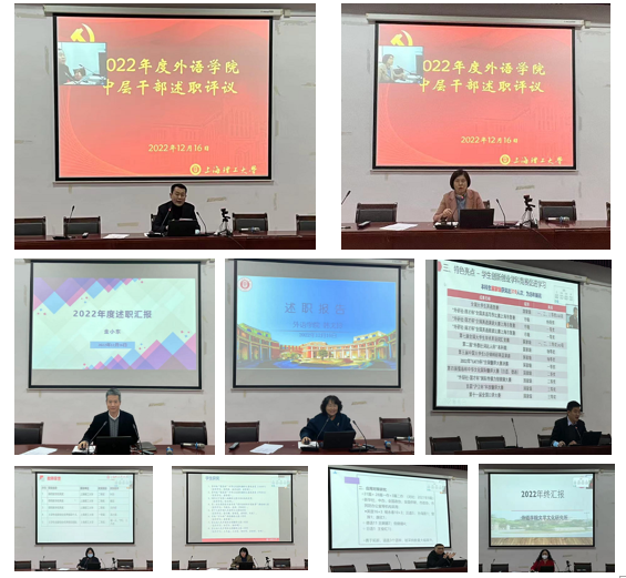 副书记金小东就学生党建、志愿者服务、征兵工作等进行了汇报,重点介绍了通过发动学院全体老师攻坚克难,实现了全员、全过程、全力推动毕业生就业,并取得了就业率达标的出色成绩。副院长韩戈玲围绕政治学习与一岗双责,研究生人才培养成效等工作的创新与特色方面进行了汇报,着重介绍了研究生竞赛获奖和首届“沪江杯”翻译大赛的情况。副院长张乐围绕分管工作,介绍了学院大思政课工作方案、专业建设、学科竞赛、教研育人和大英教学改革等方面取得的多项突破性成绩。