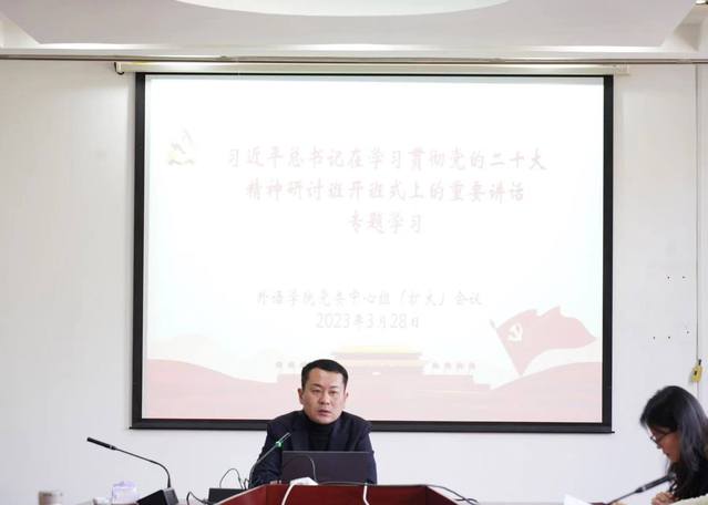 3月28日下午,Beat365登陆网站党委中心组举行《习近平总书记在学习贯彻党的二十大精神研讨班开班式上的重要讲话》专题学习会。学院党委书记曲德强主持会议并做导读报告。学院党政班子成员、党委委员、支部书记、辅导员等参加了学习。