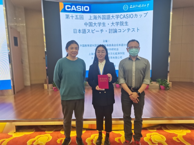 2023年5月20日,由上海外国语大学日本文化经济学院、教育部高校外语专业教学指导委员会日语分委员会、中国日语教学研究会、卡西欧(中国)贸易有限公司联合主办的第十五届上海外国语大学“卡西欧杯”中国日语专业本科生•研究生演讲辩论大赛决赛在上海外国语大学虹口校区成功举行。来自厦门大学、北京大学、上海外国语大学、南京大学、中山大学等国内知名23所高校的24名选手同台竞技、展现出各自出色的日语表达能力和思辨能力。Beat365本科2020级日语专业郭珂妤同学通过初赛选拔成功进入决赛,在决赛激烈的角逐中获得优胜奖。日语系江春华老师、福井祐介老师在比赛前期进行了精心的指导,获得“优秀指导教师奖”。