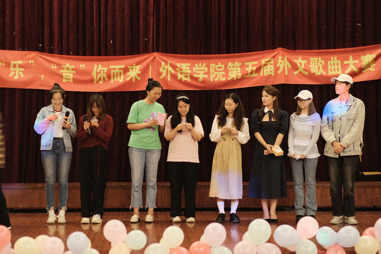 游戏环节后下半场的比赛随即开示。首先5号选手杨紫叶出场,一首《Because of You》唱出了爱情的细腻,全场大合唱仿佛是生活中爱情的芬芳。而后6号选手魏梦丹的韩文歌曲《기억을걷는시간(游走记忆的时间)》用独特的旋律和韩语情感,深深触动了每个观众的心弦。7号选手王岚淇的歌声如春水般清澈,一首《Gotta Have You》融进了自己最真挚感人的情感。最后,8号选手吴雨婷的《Older》清澈动人,以动人旋律点燃了本场比赛最后的激情,为第五届外文歌曲大赛划下圆满句号。