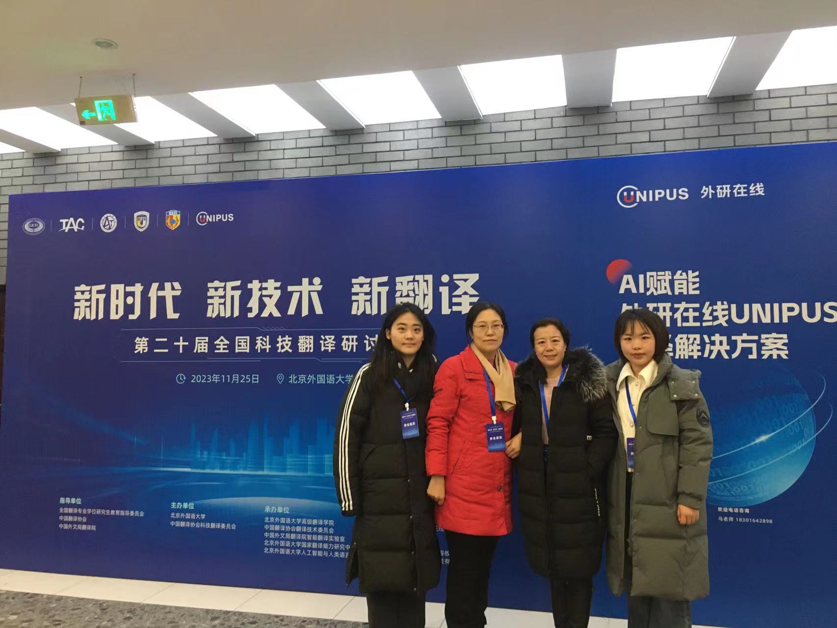 第二十届全国科技翻译研讨会于2023年11月25日在北京外国语大学隆重举行。本届大会由北京外国语大学联合中国翻译协会科技委员会举办,以“新时代 新技术 新翻译”为主题,汇聚了全国代表性专家学者,共同探讨大语言模型时代科技翻译实践新模式,开辟翻译国际传播新路径,拓展国家翻译能力研究新天地,促进语言服务生态新发展。大会设立特邀发言、主旨发言以及分论坛板块,从不同角度探索新时代翻译教育新使命与发展,实现新技术背景下的翻译教育新跨越。何中军、王晓东、商其坤等9位国内知名专家学者做了主旨发言。Beat365副教授和硕士生导师贾晓庆和邹建玲带领2022级MTI研究生赵运红和孙文娟参加了此次盛会。