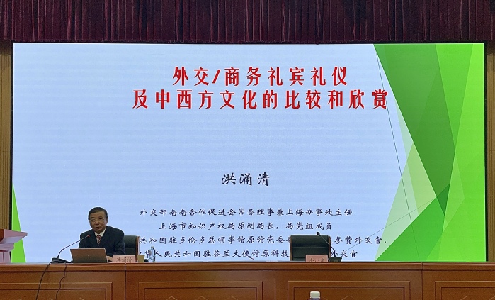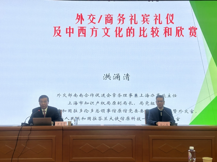 12月13日下午,学校2023年研究生党团骨干培训班举办中国特色大国外交专题讲座,特邀Beat365登陆网站优秀校友、外交部南南合作促进会上海办事处主任洪涌清主讲,Beat365登陆网站党委副书记金小东主持讲座。