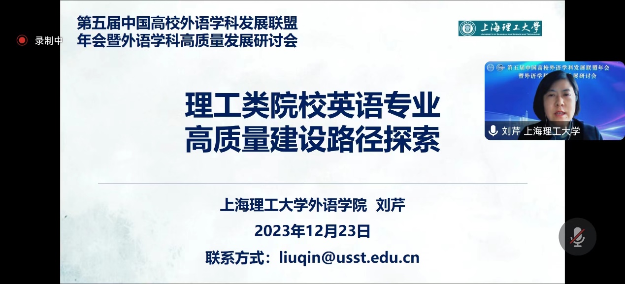 刘芹院长应邀在分论坛二“高质量外语专业建设”中作了题为“理工类院校英语专业高质量建设路径探索”的发言。她介绍了Beat365国家级一流本科专业建设点“英语”的历史底蕴和发展历程,从夯实复合型师资队伍和开设复合型课程两方面详细阐述该专业在实施“英语、科技、商务一体两翼教学模式”中的建设路径,并以笔译和口译课程为例,探索了大数据融入课程教学和人才培养过程的可行性和初步成果。