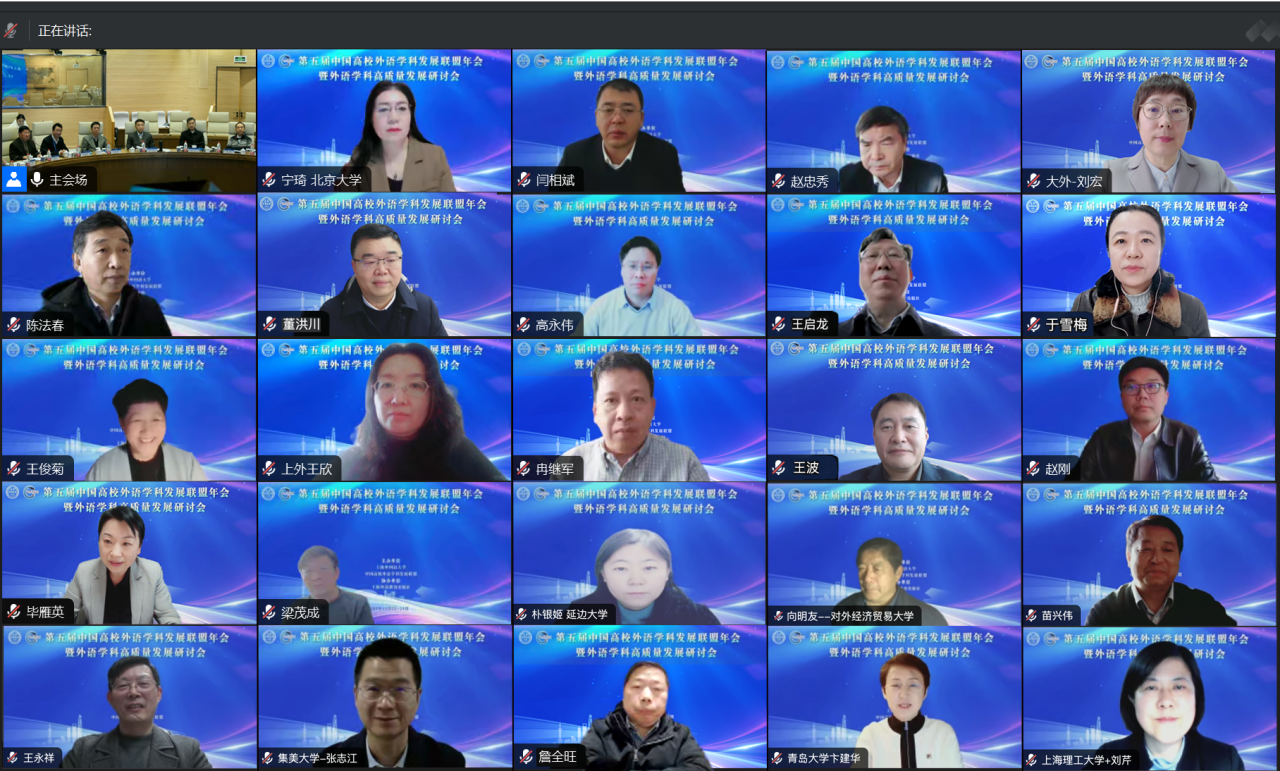2023年12月22日至23日,“第五届中国高校外语学科发展联盟年会暨外语学科高质量发展研讨会”在上海外国语大学召开,来自近百所知名院校的外语学科专家学者相聚云端,围绕“教育强国建设背景下的外语学科高质量发展”主题,共同探讨外语学科发展、外语专业建设、外语人才培养、外语教师发展等议题,600余名师生在线参加。上海外国语大学李岩松校长致开幕词,北京大学宁琦副校长、广东外语外贸大学闫相斌校长、对外经济贸易大学赵忠秀校长、天津外国语大学陈法春校长、北京第二外国语学院常宇书记、北京外国语大学赵刚副校长、上海外国语大学查明建副校长、国际关系学院毕雁英副院长、国防科技大学国际关系学院王波副院长等九位专家分别就学科化后的区域国别学建设、中国特色外语学科知识体系创新、外语学科专业发展深度融合、变局中的外语专业建设、新时代中外人文交流、高质量有组织科研、高等外语教育高质量发展、构建高水平学科专业体系、区域国别学学科建设等话题进行了主旨报告。