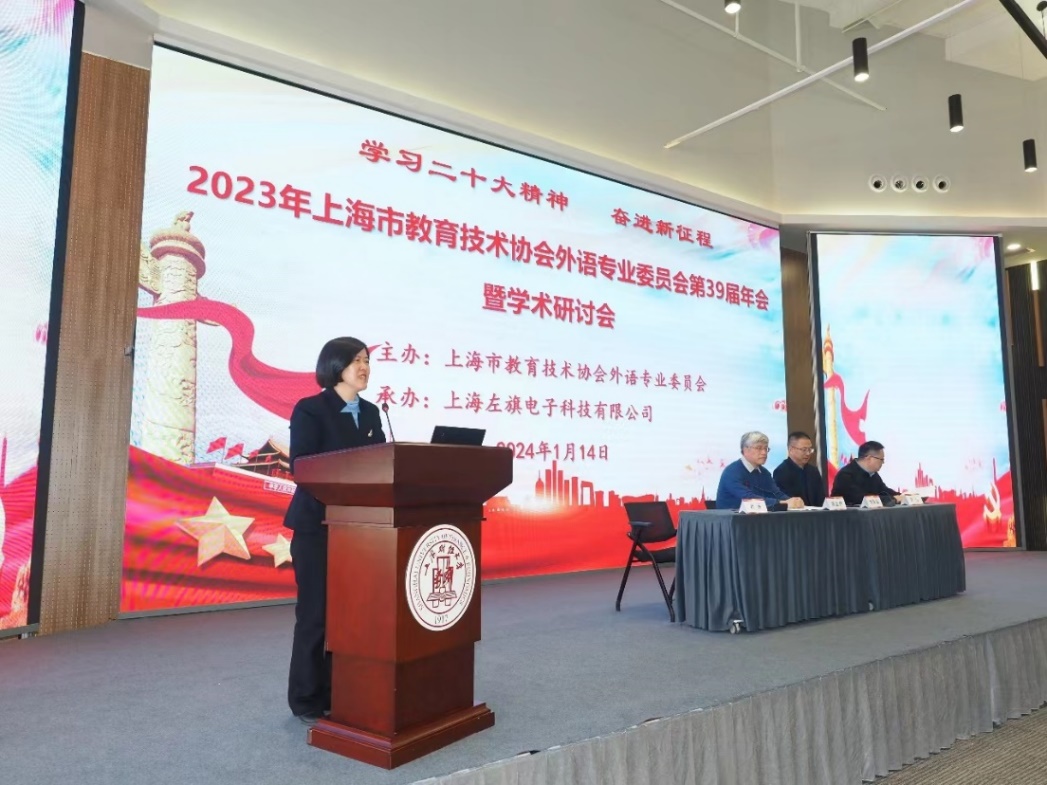 会上,上海市教育技术协会外语专业委员会会长、上海外国语大学陈坚林教授作《2023年上海市教育技术协会外语专业委员会工作报告》。报告回顾了2023年协会的主要工作,指出协会在党的教育方针指引下,宣传和推广外语教育与教学经验,加强校企协作,开展多项学术研究工作,举办了优秀论文评选活动。陈坚林在报告中强调了数字化转型的重要性,鼓励参会教师寻找技术、教材、教学内容三点之间的关系,促进外语教学的内涵发展。