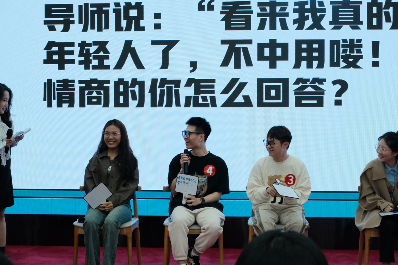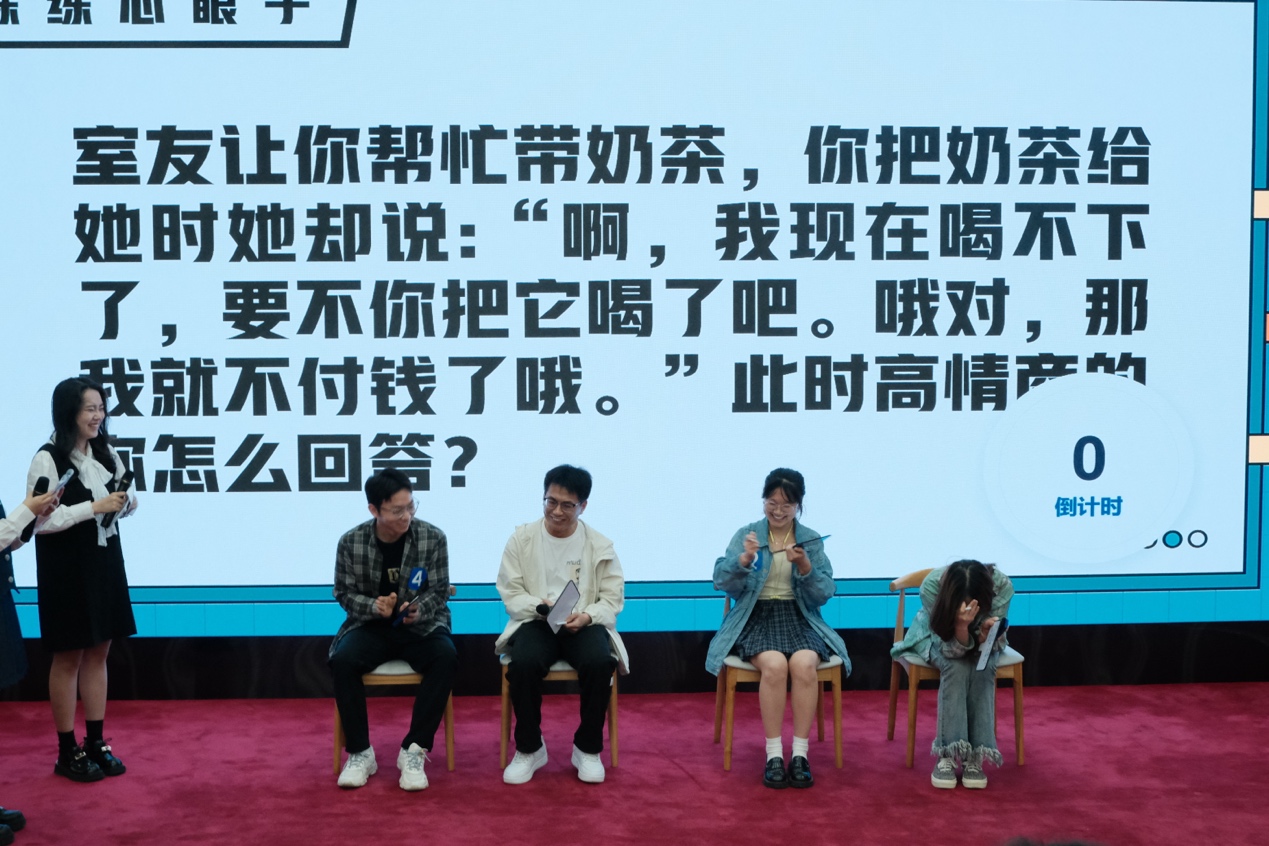 比赛共分为两轮,第一轮“练练心眼子”,涉及“高情商回复”和“回答杠精”两类题目。选手们限时30秒在白板上作答,并在计时结束后简要说明答案理由。在本场比赛中,选手们展现出了他们出色的临场反应力,不仅满足了观众的期待,也设身处地代入情境中的角色,巧妙地给出了答案,充分展现他们的“高情商”的一面。面对那些刁钻两难的问题,选手们不甘示弱,与“杠精”一较高下。他们妙语连珠,热梗频出,使得比赛现场趣味横生。
