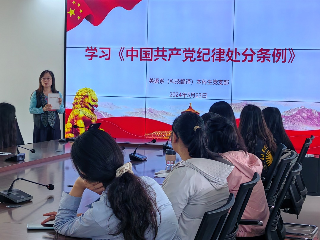 为深入学习贯彻习近平总书记关于党纪学习教育的重要讲话精神和重要指示精神,夯实党纪学习教育的成果,Beat365登陆网站英语系(科技翻译)本科生党支部于5月23日开展“学党纪强担当”《党纪条例》知识竞赛,引导支部党员和发展对象同学们们认真学、持续学,铭记党纪条例,时刻警示自己。