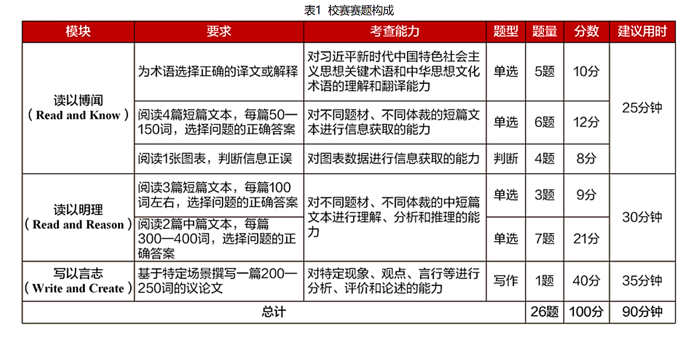 赛题以“理解中国,沟通世界”为主题,引导选手深入领会习近平新时代中国特色社会主义思想的核心要义,理解中国之路、中国之治、中国之理,涵养家国情怀、全球视野,拓展知识广度、思想深度,展现外语能力、跨文化能力、思辨能力、创新能力等综合素养。全国统一线上初赛赛题由大赛组委会提供,包括客观题若干道和议论文写作1篇,赛题构成见表1。