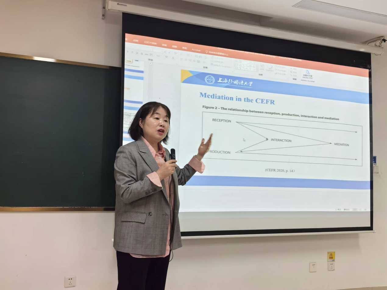 讲座中,张雪梅教授首先介绍了行动教学法的起源与发展,及相关概念在《欧洲语言参考框架》中的体现,然后说明行动教学法如何应用于英语教学。此外,张教授探讨了行动教学法和批判教学法在中国文化教学中起到的作用。张雪梅教授的讲座体现了语言文化教育的前沿视角,用实例生动地展示了理论在实践中的应用方法,使师生们拓宽了研究思路,提升了研究兴趣。讲座后,张教授还与与会师生进行互动交流,耐心回答了关于讲座内容的问题,并对如何培养和提升研究能力提出了宝贵建议。张教授之后还对部分老师的课题申报书和论文稿进行了一对一指导,并为提高大家的项目申报和论文撰写质量提出了建设性意见。