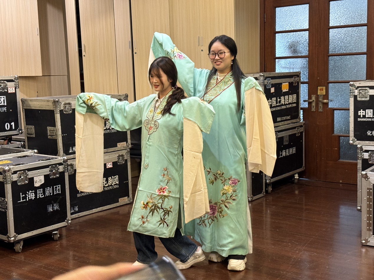 接着,同学们迎来了此次参观的第二个环节——参观昆曲演员们排练。讲解员介绍道这场排练是与故宫合作表演的一场新戏,引起不少同学好奇。排练厅里,演员们一招一式、一颦一笑都尽显功力。他们在举手投足间将昆曲的韵味展现得淋漓尽致,水袖轻舞如行云流水,唱腔婉转似黄莺出谷。学生们在剧场里静静观看,被这专注投入的排练氛围深深感染。这种近距离的观摩,让学生们感受到了昆曲艺术的严谨与魅力,也对这些坚守传统艺术的演员们肃然起敬。