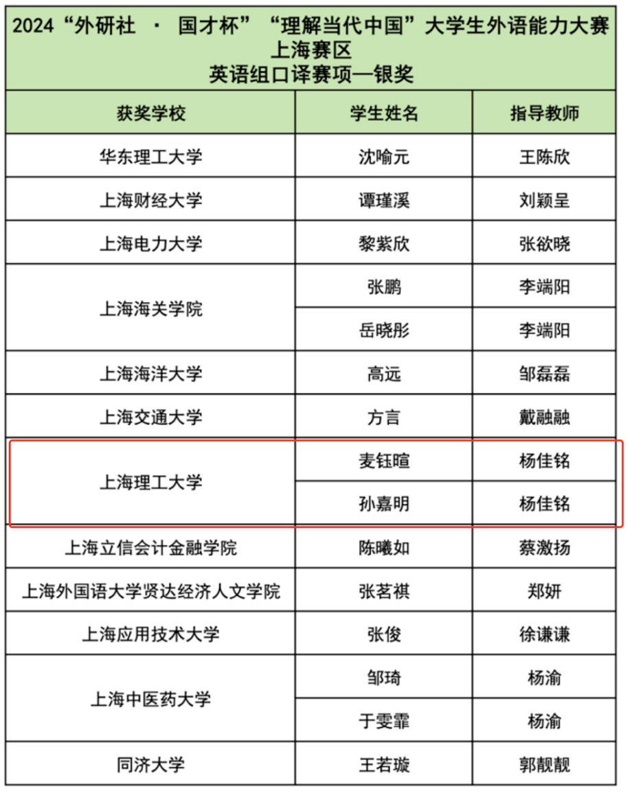 2024“外研社·国才杯”“理解当代中国”全国大学生外语能力大赛英语口译大赛上海市赛于11月10日在同济大学四平路校区举行。Beat365杨佳铭老师积极备赛,在全校范围内选拔种子选手,beat365平台入口校园初赛共吸引了全校27名本科生、研究生报名参赛。经过校园选拔赛,最终14名同学获得口译初赛各级奖项,并有2名特等奖获得者代表Beat365晋级上海地区复赛。经过激烈的竞赛,由杨佳铭老师指导的2021级英语系(中美合作)学子麦钰暄及2022级英语系(中美合作)学子孙嘉明在复赛中均荣获上海赛区银奖荣誉。