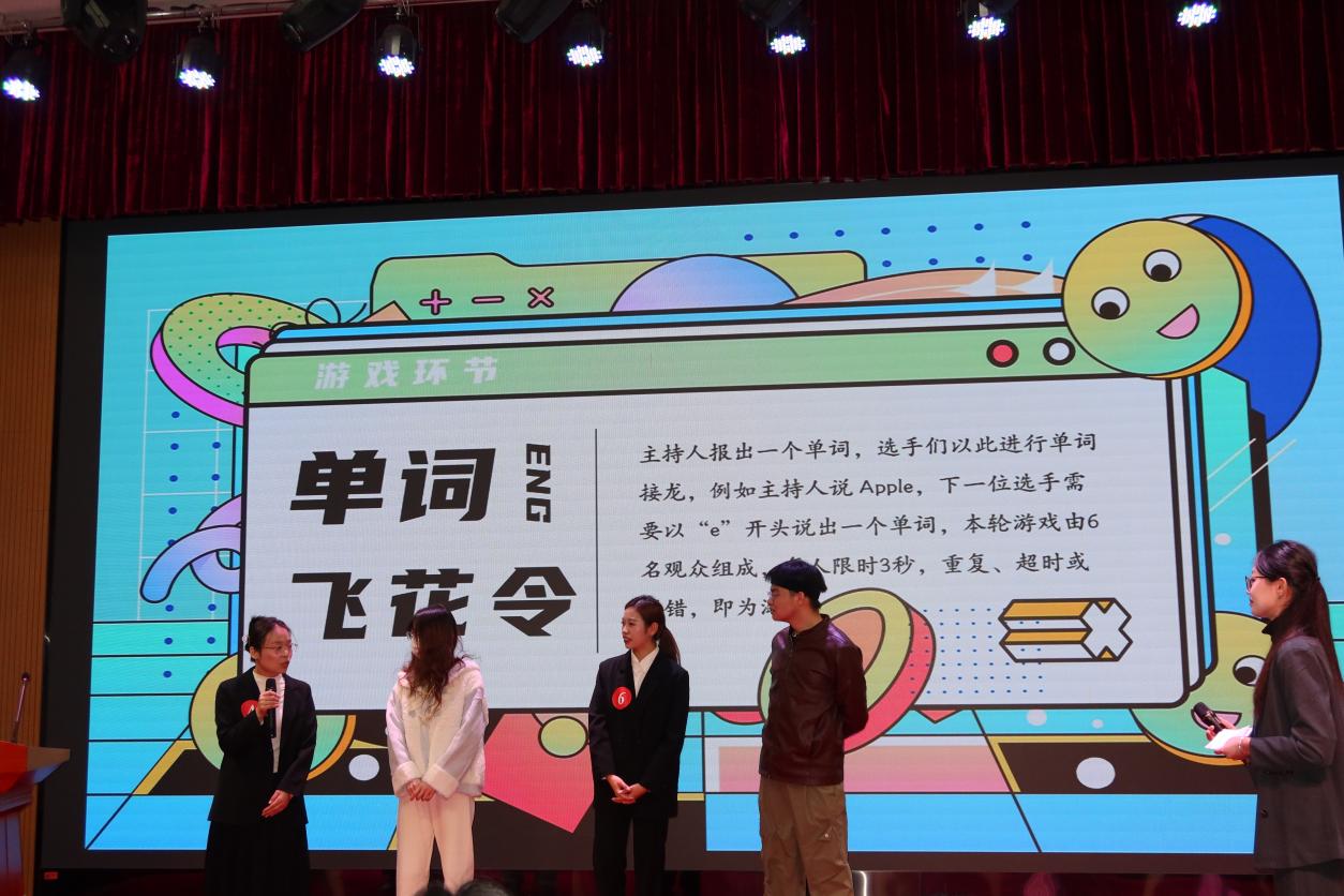 比赛期间还有两次互动环节:英文单词飞花令和符号猜猜猜。观众们热情积极参与游戏,参与者还获得了精美礼品,现场气氛异常热烈,互动频繁。