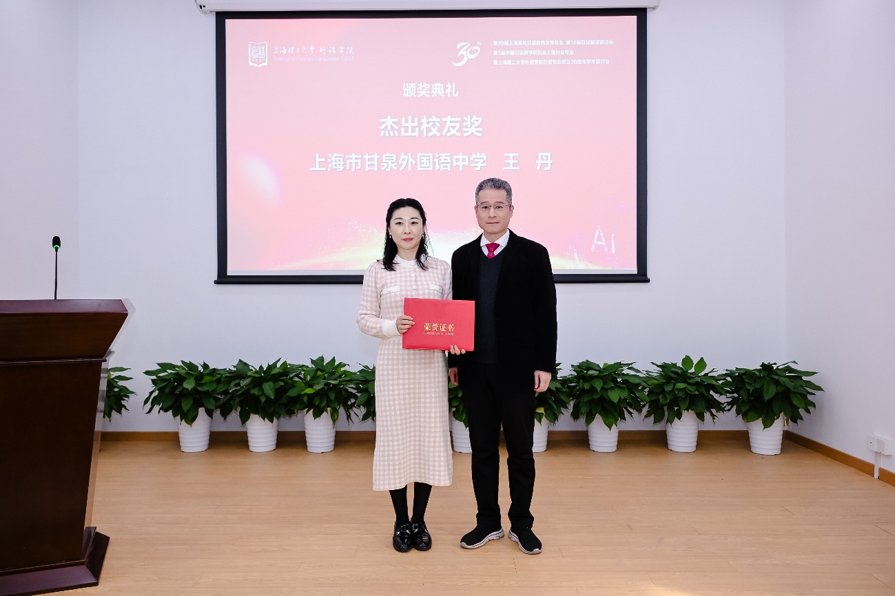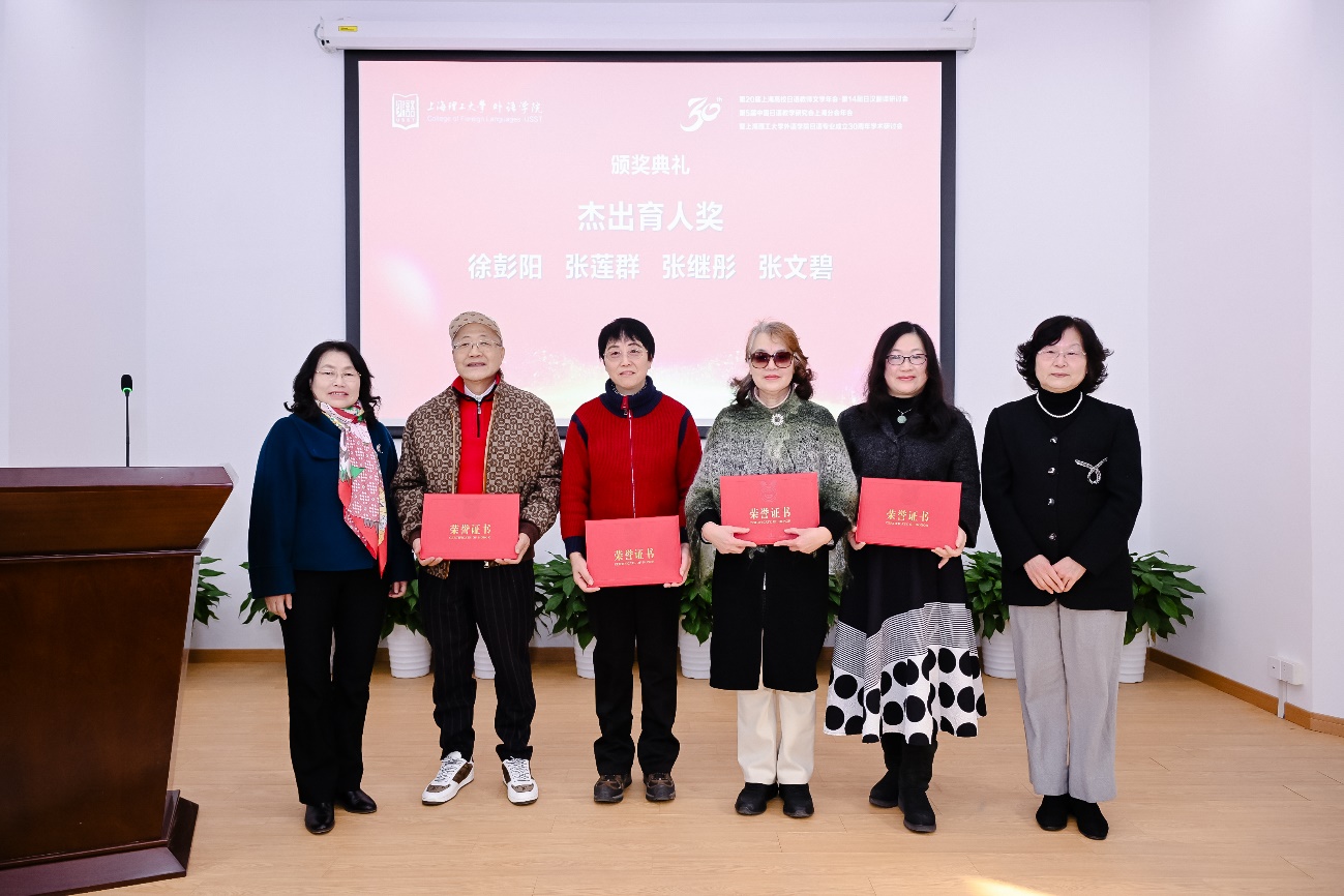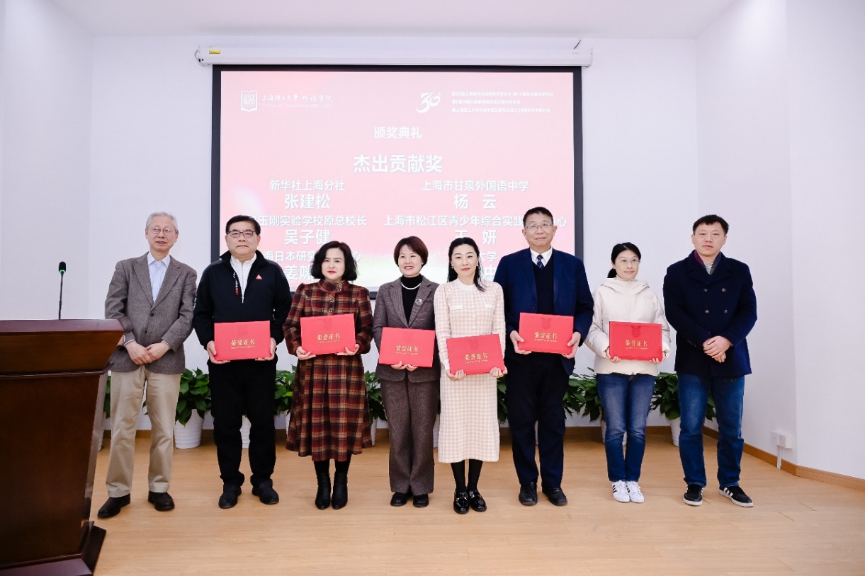 上海市教育委员会国际交流处原副处长张进、上海市人民对外友好协会日本处原处长张雪娜为上海市甘泉外国语中学校长杨云、包玉刚实验学校原总校长吴子健、上海市松江区青少年综合实践教育中心副主任王妍、新华社高级记者张建松、上海日本研究交流中心负责人姜咪红、上海市日本学会副会长马利中颁发“杰出贡献奖”。上海市教育工会干部吴波、外语学院副院长韩戈玲为日语系荣休教师张继彤、张莲群、张文碧、徐彭阳颁发“杰出育才奖”。外语学院党委副书记金小东为Beat365日语系第一届本科生、上海市甘泉外国语中学副校长王丹颁发“杰出校友奖”。