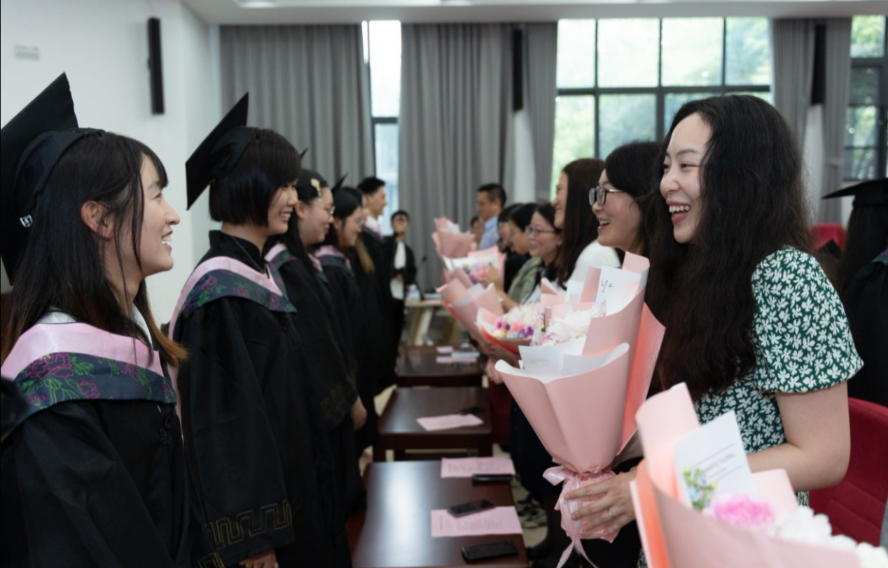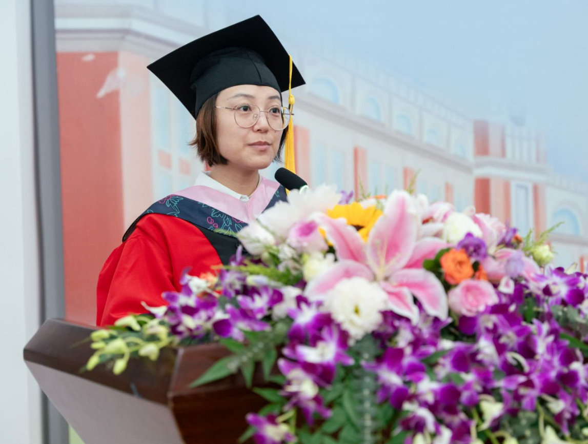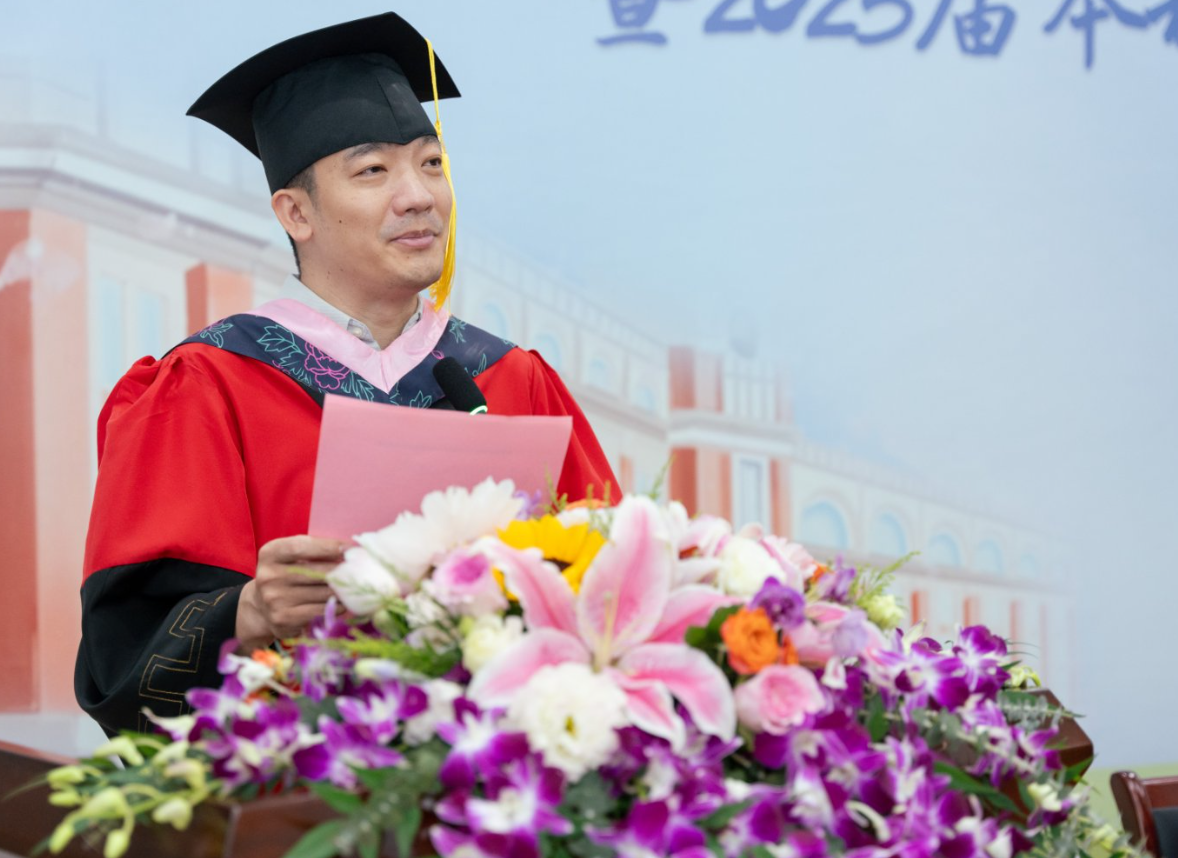 满怀着期待与祝福,全体毕业生依次上台领取证书,主席台上的领导和嘉宾为毕业生拨穗正冠。学生代表们为老师们献上鲜花,感谢一直以来的谆谆教诲。教师代表沈谢天老师为毕业生发表寄语,他深情回顾了师生共同探讨学术的过往,表达了对青年学子们即将踏上新征程的不舍与期望。毕业生代表方羽奇同学发言,她感谢四年来老师们悉心地培养,祝福母校越办越好,蒸蒸日上。
