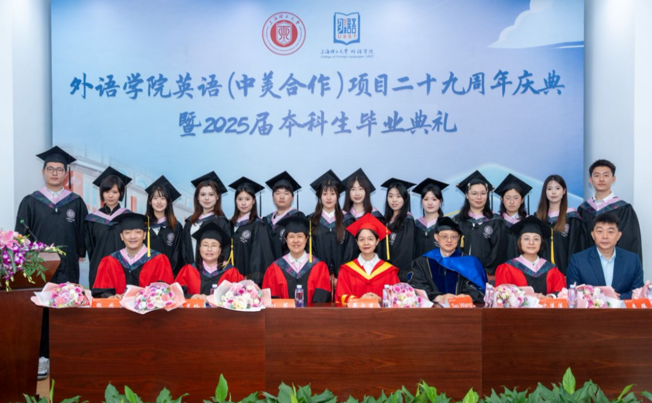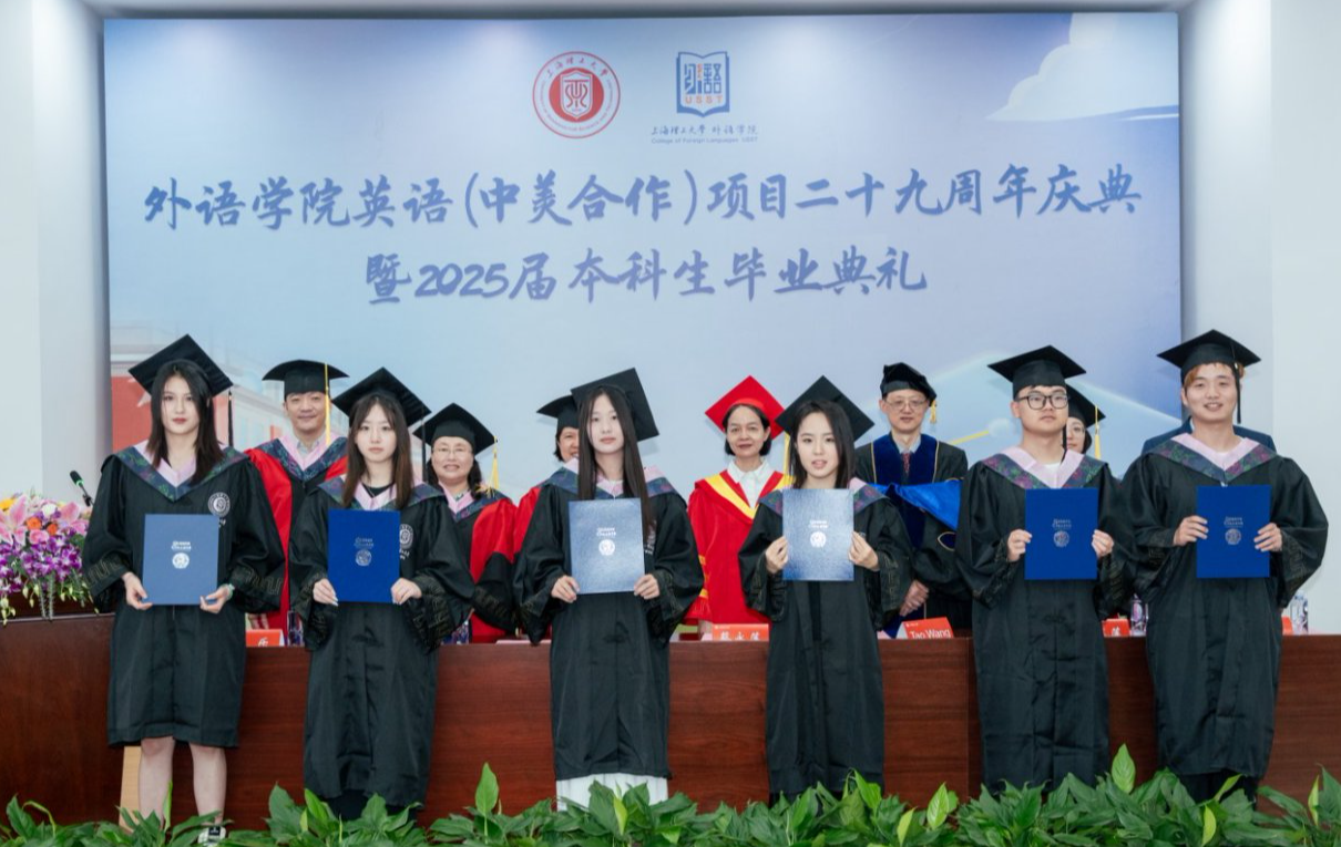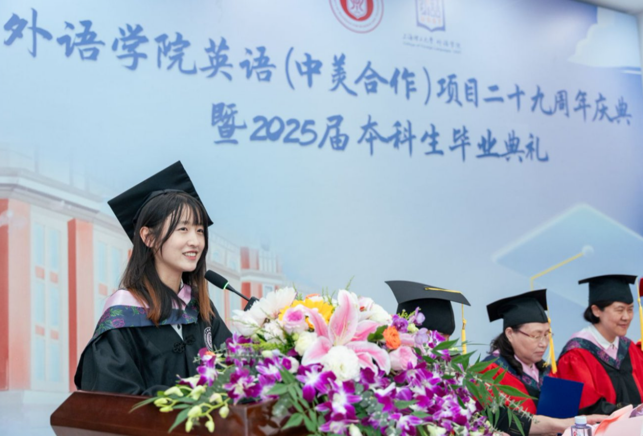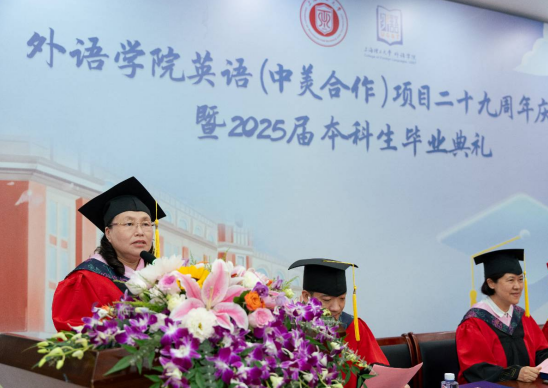 蔡永莲副校长致辞,她回顾了英语(中美合作)专业的发展历程,向为合作项目付出辛勤努力的中美双方老师表示衷心的感谢,向各位毕业生同学表示由衷的祝贺,以今年上海高考作文题"专·转·传"为启,愿青年学子以"专"筑基、以"跨"破界、以"传"致远,深耕专业沃土厚植家国情怀,跨越文化藩篱联通世界脉搏,最终成长为有根有魂的文明传播者。希望全体毕业生牢记“信义勤爱、思学志远”校训,努力工作,展现中国青年的智慧与担当,向世界传递可信、可敬、可爱的中国形象。