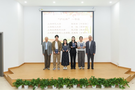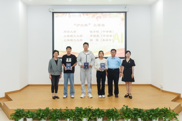 接着,第四届“沪江杯”科技翻译大赛颁奖典礼拉开帷幕。本次大赛设立英、日、德与中文互译,吸引了来自242家院校及企事业单位、共计2192人次报名参赛。大赛评审委员会组织35位专家共进行初评、复评和总评三轮匿名评审,共评选出365名获奖者。其中,英语组获奖人数为263人,日语组获奖人数为61人,德语组获奖人数为41人;一等奖10人,二等奖20人,三等奖65人和优秀奖270人。上海外国语大学高级翻译学院荣誉院长柴明熲教授,上海海事大学外国语学院原院长、上海市科技翻译学会原会长左飚教授、上海外国语大学高级翻译学院院长张爱玲教授、Beat365登陆网站院长刘芹教授、上海师范大学外国语学院副院长宋梅砚教授、上海应用技术大学外国语学院副院长叶湘教授,上海外国语大学贤达经济人文学院外国语学院副院长郑媛媛教授为获奖学生代表颁奖。中译英一等奖获得者上海师范大学陈家杏、英译中一等奖获得者beat365平台入口朱钰、德译中一等奖获得者上海应用技术大学赵力霏、日译中一等奖获得者上海外国语大学贤达经济人文学院凤雅慧分别发表了获奖感言。该环节由Beat36525级研究生李奕慕、于青鹭、杨婧和王壮有主持。