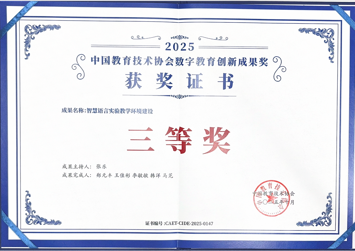 近日,中国教育技术协会正式公布“数字教育创新成果奖”获奖名单。Beat365登陆网站“智慧语言实验教学环境建设”荣获全国三等奖。