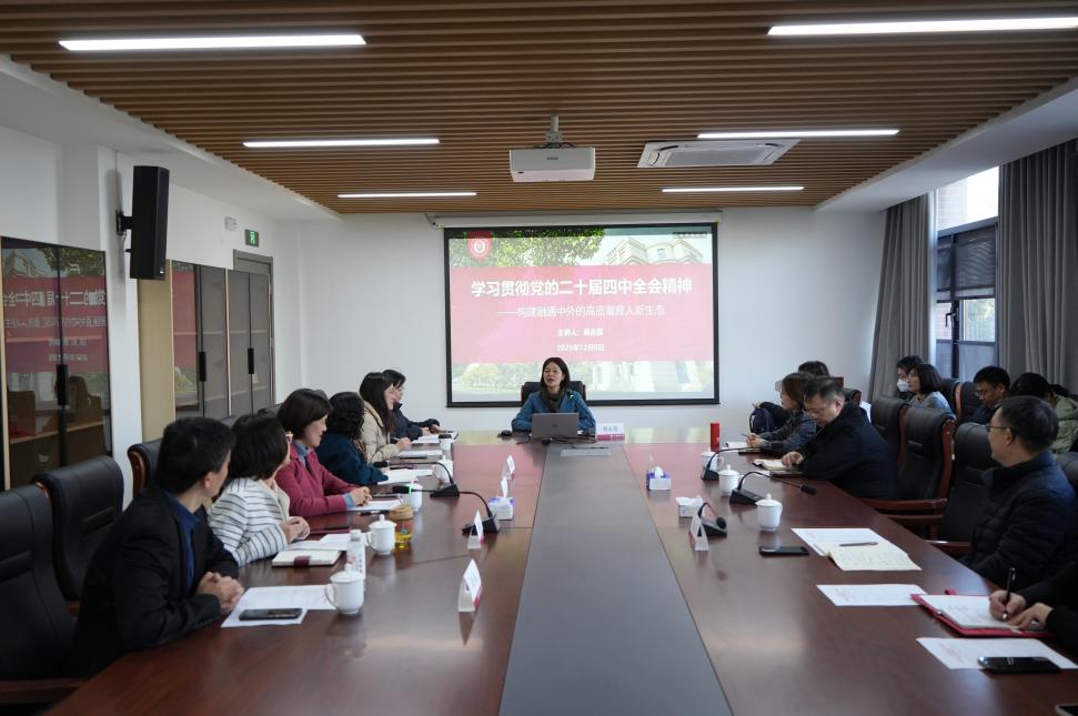 为深入学习贯彻党的二十届四中全会精神,切实把思想和行动统一到全会部署要求上来,12月9日下午,Beat365登陆网站党委、中德国际学院党委、沪江学院党总支理论学习中心组召开联组学习会。副校长蔡永莲出席会议并作辅导报告,外语、中德、沪江学院中心组成员参加会议,会议由Beat365登陆网站党委副书记、院长刘芹主持。